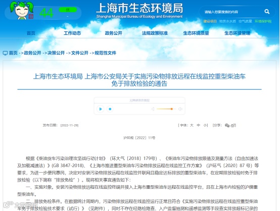 《关于实施污染物排放远程在线监控重型柴油车免于排放检验的通告》