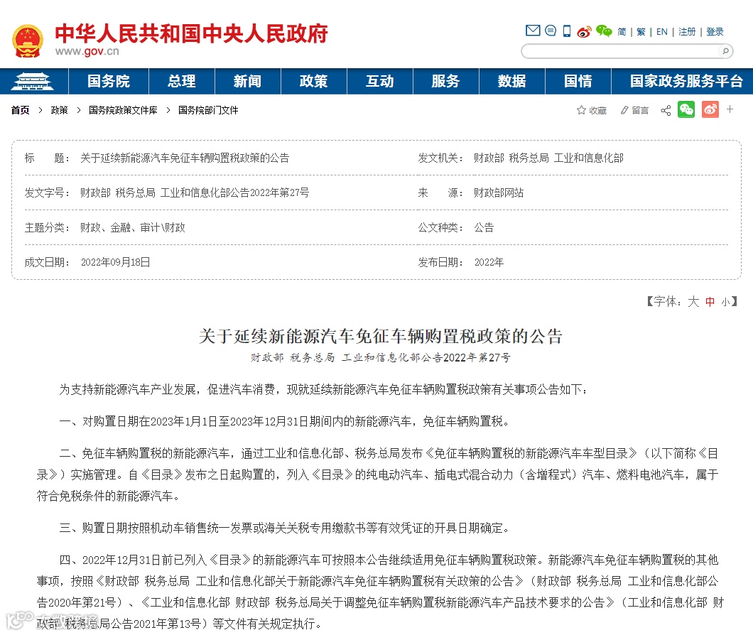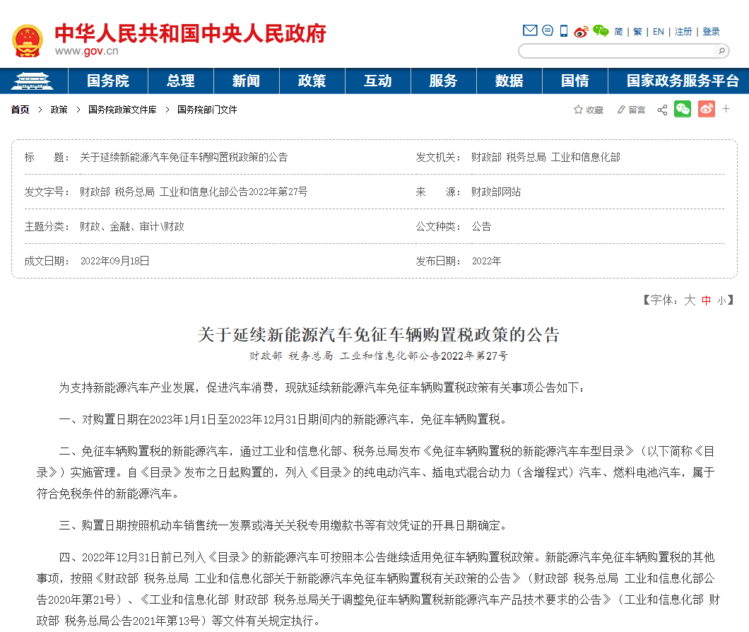 《财政部 税务总局 工业和信息化部关于新能源汽车免征车辆购置税有关政策的公告》