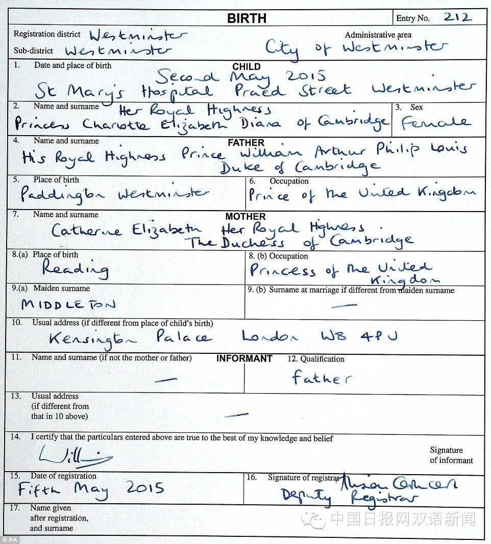 昨天英国皇室公布了夏洛特公主的出生证↓