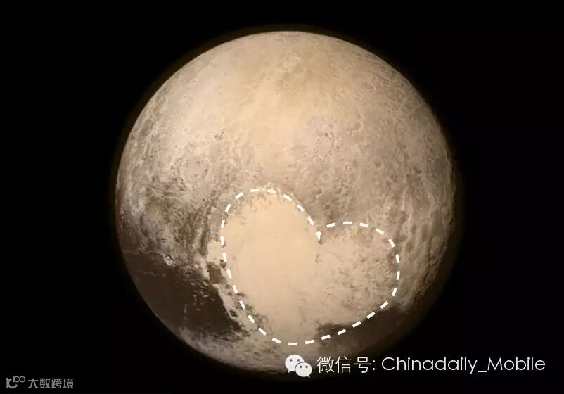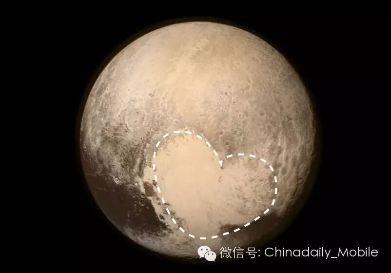 令科学家们更加惊喜的是“新视野”号13日拍摄的冥王星清晰照片显示出这个46亿岁的星球上有一个巨大而明亮的心形区域。