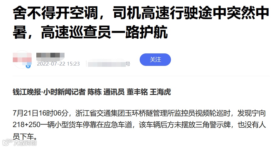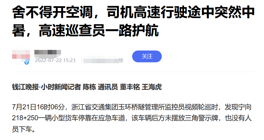 7月21日,浙江台州一辆货车紧急停靠在应急车道,巡查员到达现场后发现驾驶员似有中暑现象。后经询问得知,因夏天耗油高,为了省钱,货车师傅舍不得开空调,车内温度过高导致身体不适,头昏眼花。