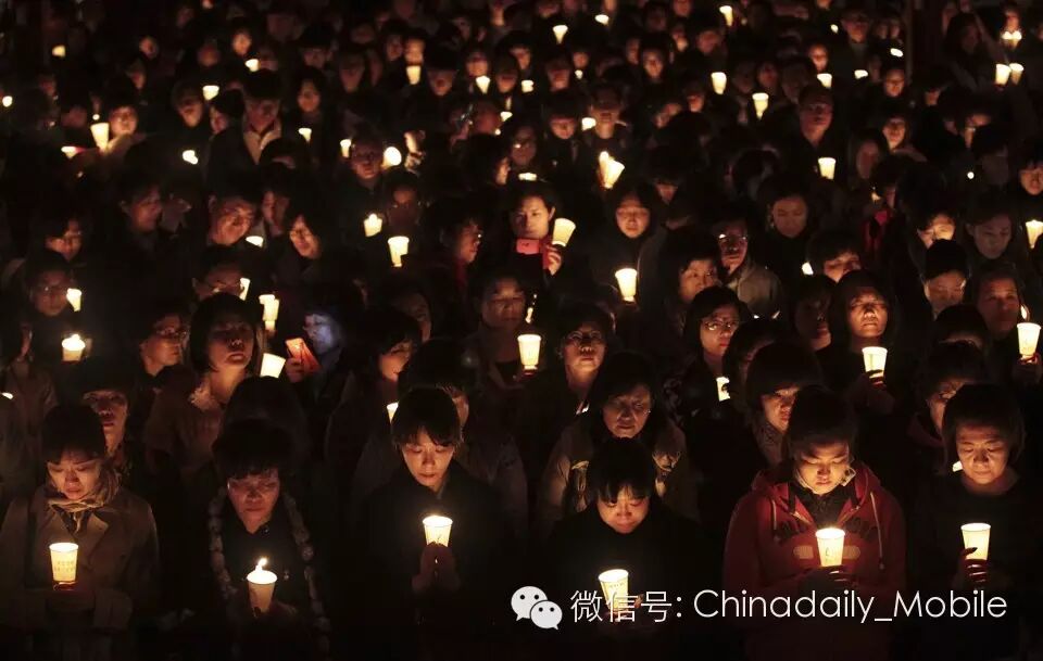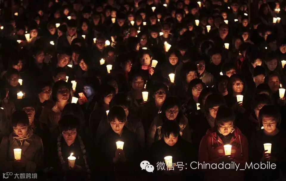 2013年11月2日,韩国首尔,家长们聚集在一所佛寺,点烛祈祷(pray during a candle-light vigil)孩子们大学入学考试取得成功,全国大约有65万人参加高考