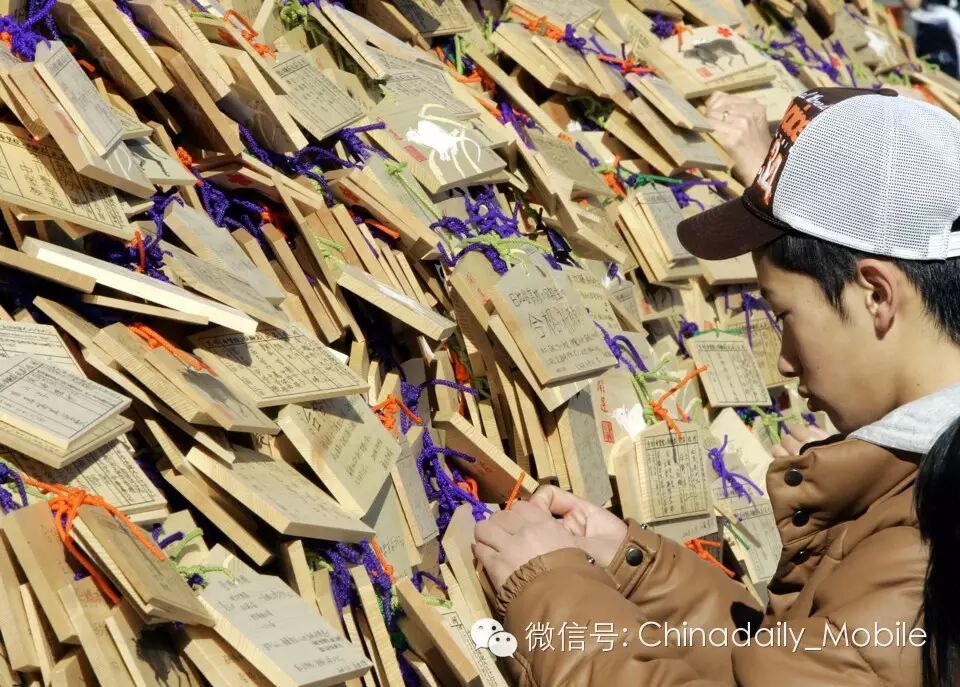 2008年1月19日,日本东京一名学生正在把自己的木制祈愿牌(wooden votive picture)绑在汤岛天神殿的广场上。在考试时期,学生和家长都会来神殿祈祷,祈求考试顺利