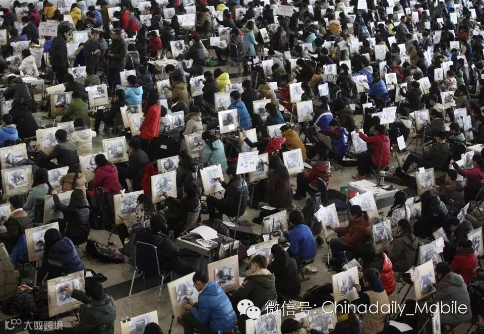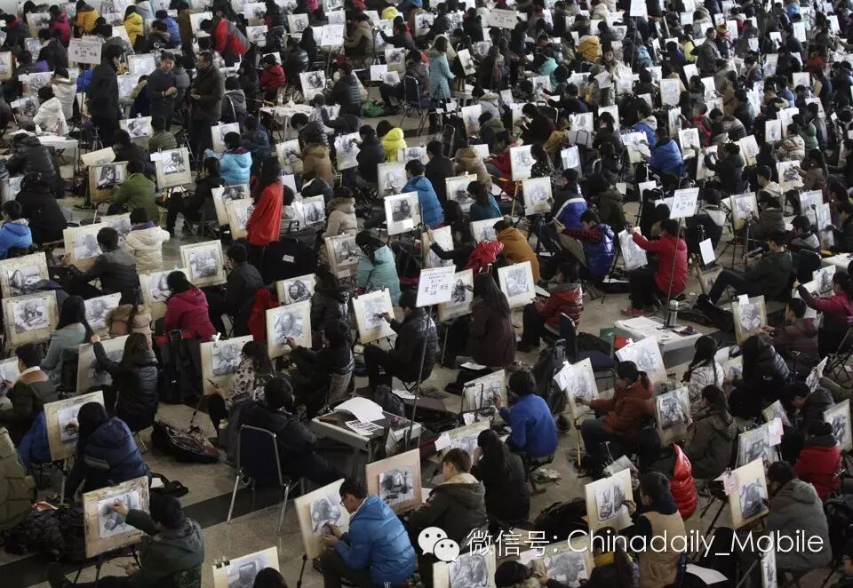 2014年2月10日,山东济南的艺术院校入学考试上,8000多名学生正在画素描(draw sketches)