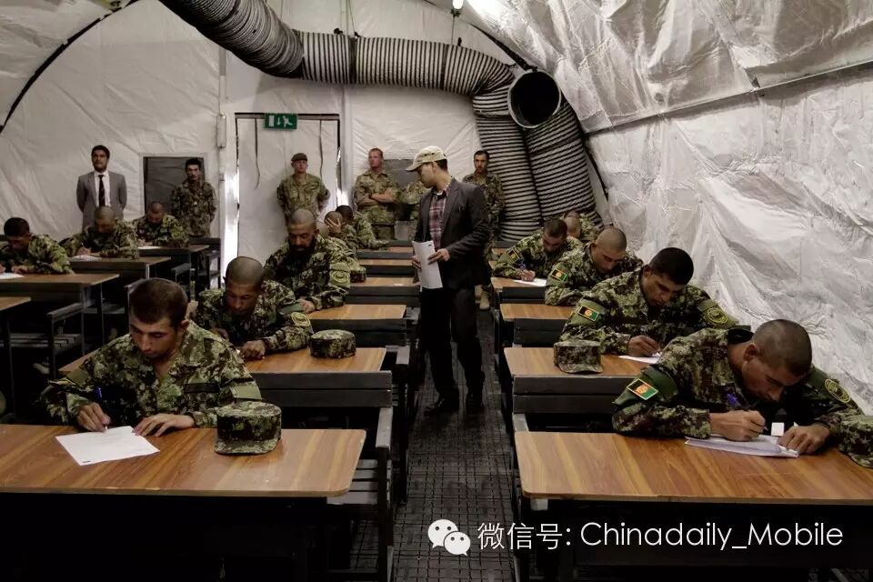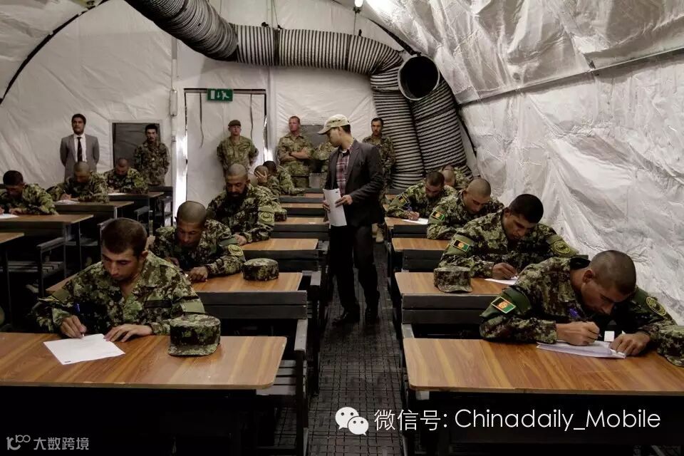 2013年10月23日,阿富汗喀布尔陆军学院(Afghan Army Academy)的军官们在就职典礼(inauguration ceremony)上参加考试,军队士兵们通过该学院更容易接受教育