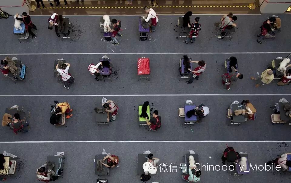2015年4月15日,湖南长沙宠物美容师认证考试(a pet-barber qualification test)上,参加者在给狗狗们修剪毛发