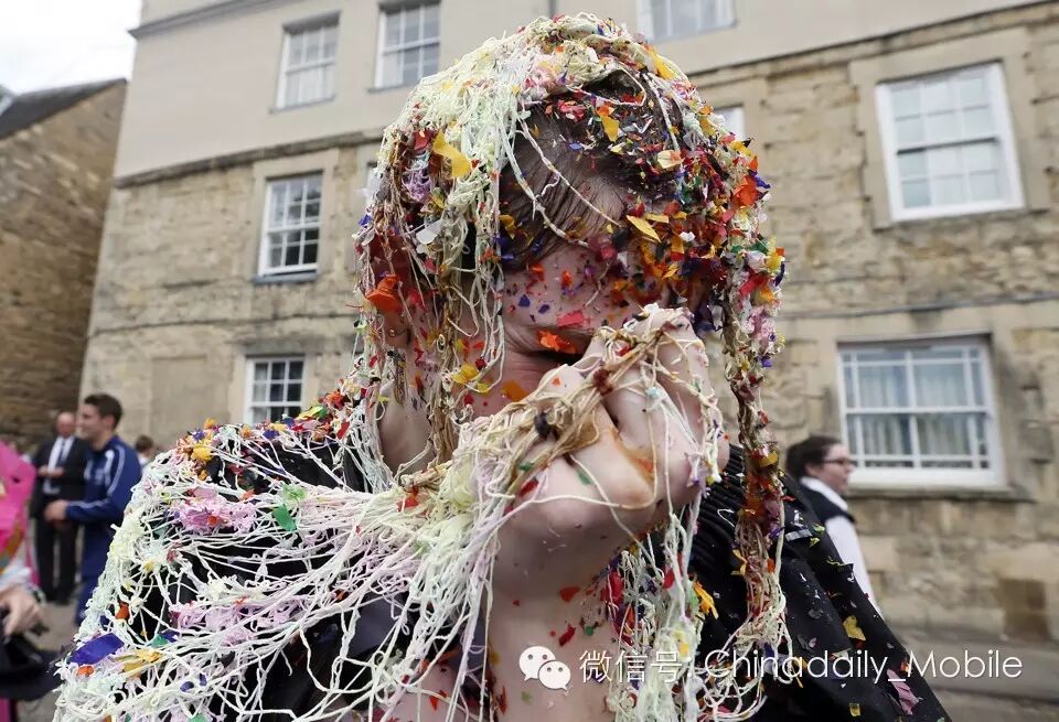 2013年6月7日,英国牛津大学学院的一名学生在考完试之后被扔东西(gets "trashed")。这种做法是牛津大学的习俗,学生完成考试后同伴会把最乱的东西扔到他们身上(throw messy items at them)