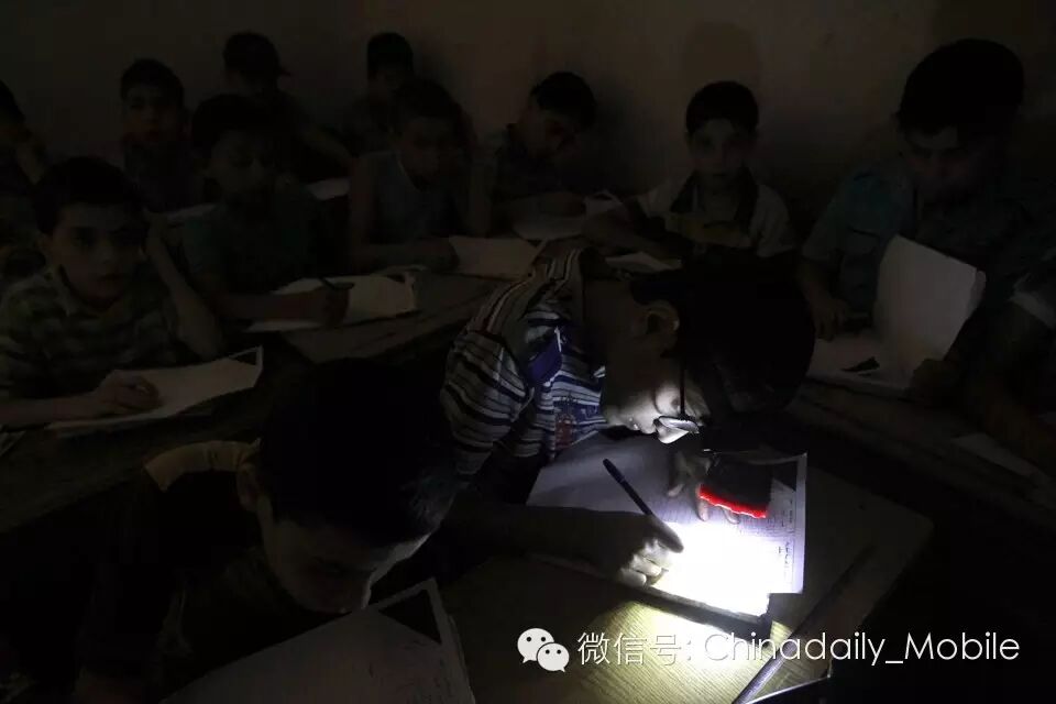 2013年6月5日,叙利亚阿勒颇的学生正在参加期末考试,由于用电短缺(due to electricity shortage),一名学生戴着头灯(wears a headlight)
