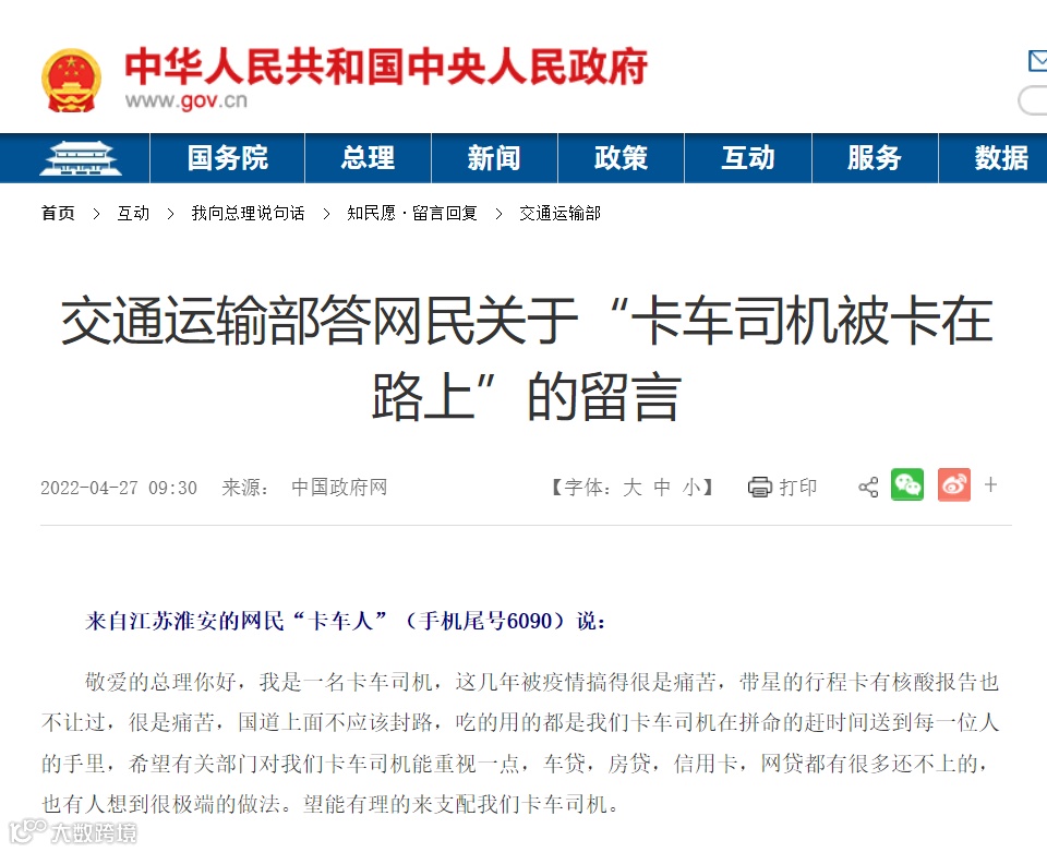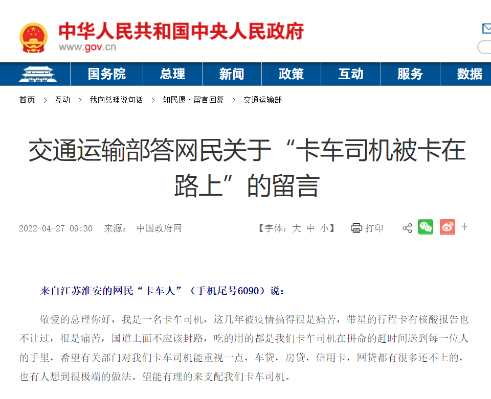 近日,有卡友在“我向总理说句话”栏目留言称被疫情搞得很痛苦,希望有关部门能提高对货车司机的重视。受到交通部门的重视。