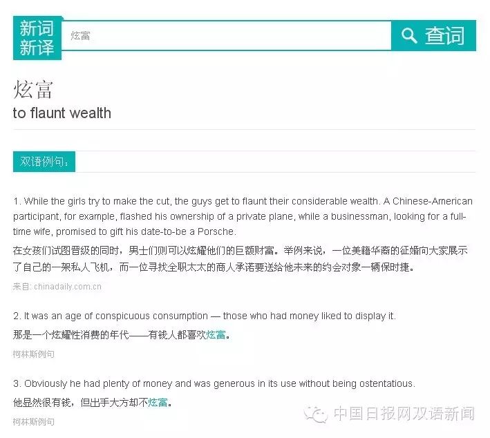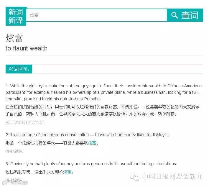 强大功能一:新词新译在线查。炫富、拜金、蚁族等这样的新兴词汇英文不知怎么说?直接在新词新译查词框搜索就有答案,还附赠双语例句哦!