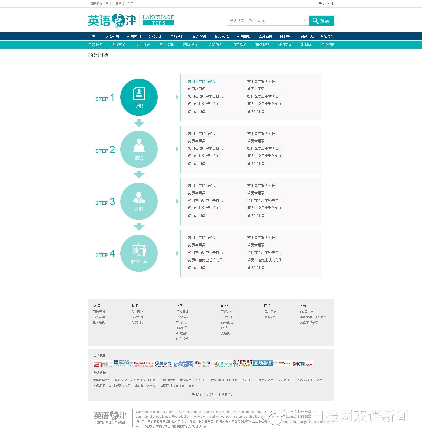 强大功能二:商务职场专区。写简历没有模板,要去外企面试却不知该如何开口?我们想您所想,专门定制了强大的商务职场专题页面。从求职、面试,到入职须知和职场生存,您想到的,我们都准备好啦!