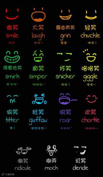 这个图里其实用到的比较多的就是smile、laugh、giggle、grin、chuckle和smirk,其他的可能用到的比较少,有些朋友看到翻译觉得不对,别紧张,这张图只显示了部分的意思,还有许多别的意思没标出来,还是要看美剧,放到情境中去用,而不是背单词。