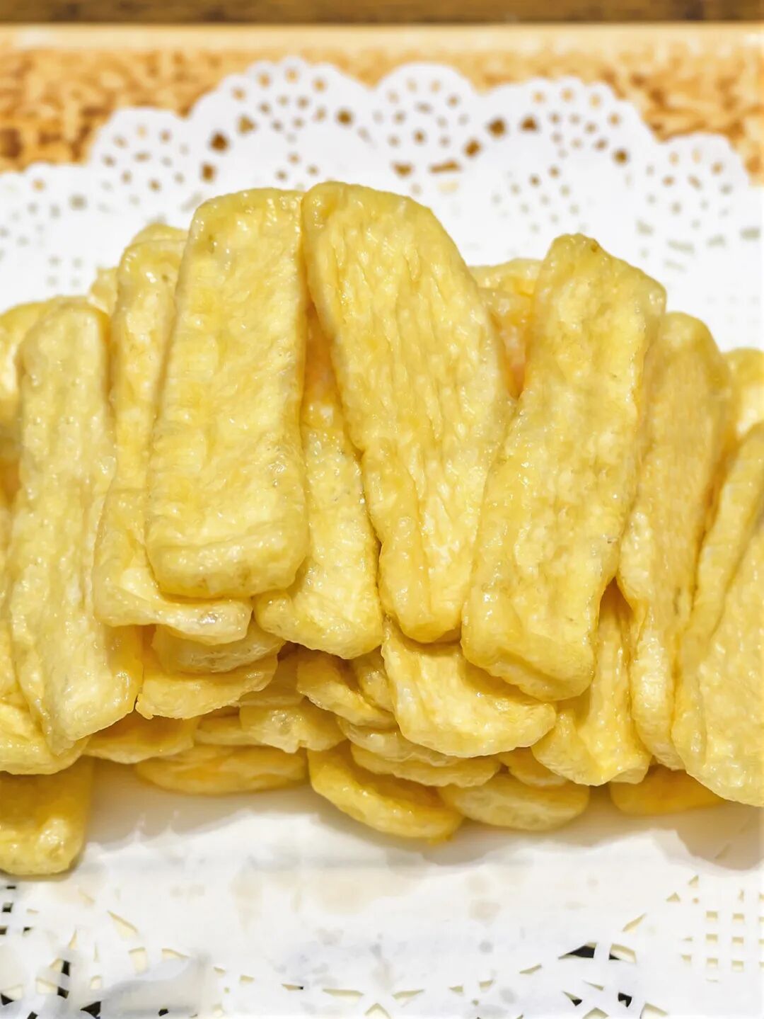 将豆腐切成薄片,油炸至金黄,外脆里嫩,香气四溢。(供图/福建省餐饮烹饪行业协会)