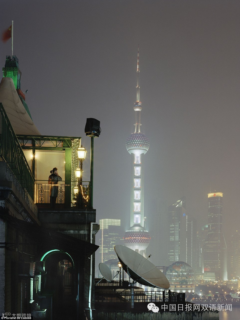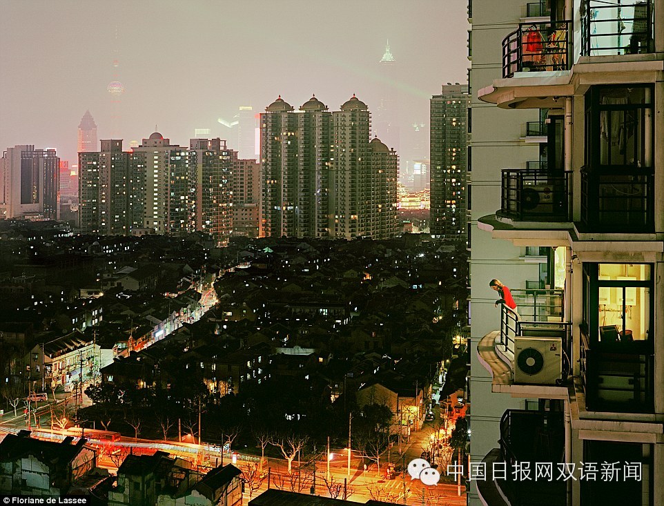 A woman in Shanghai stands on her lighted balcony and stares at the massive buildings across the water.