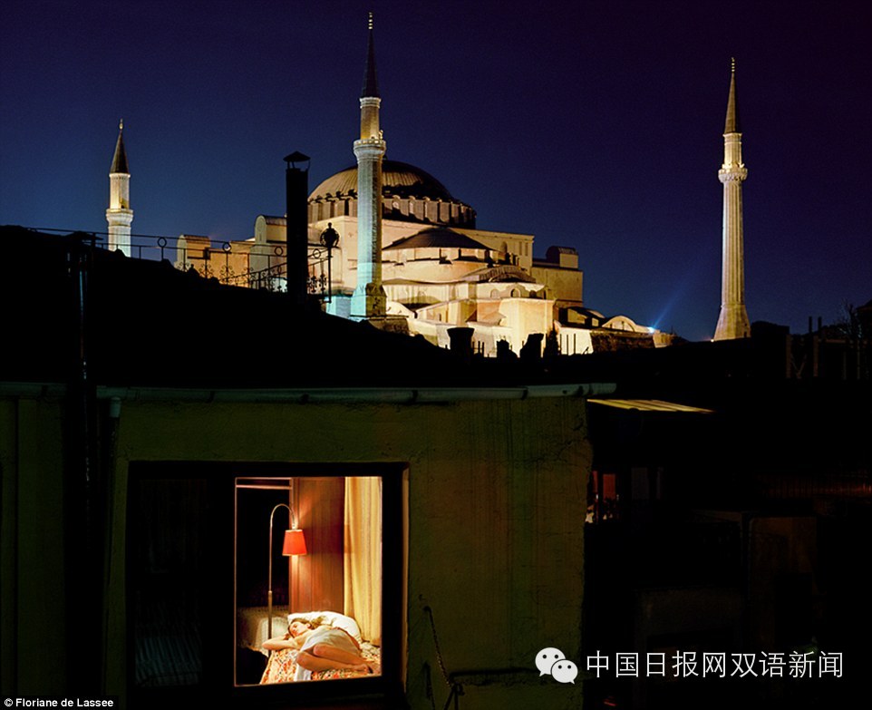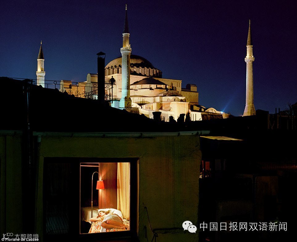 伊斯坦布尔,壮丽的圣索菲亚清真寺前的一处公寓里,一个女人正躺在一张小床上。