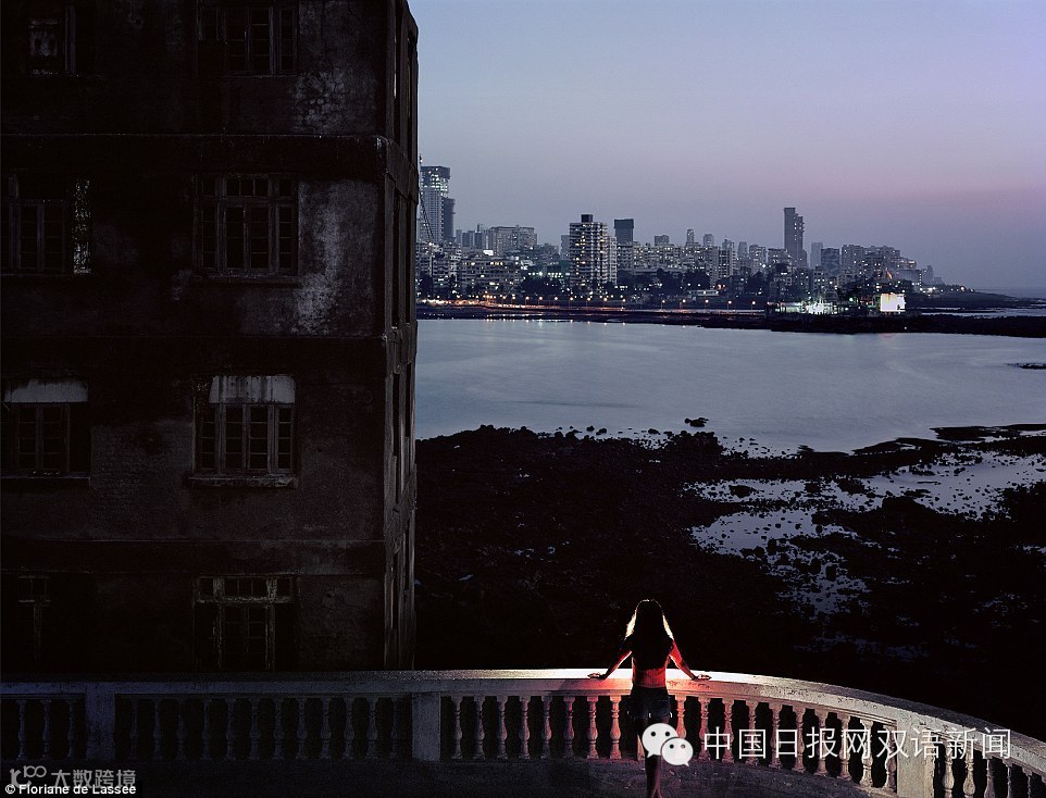 露台上,一个女孩眺望着前方的天际线。她面前的光照亮了她,在旁边残败建筑物的对照下,似乎发光的是她。