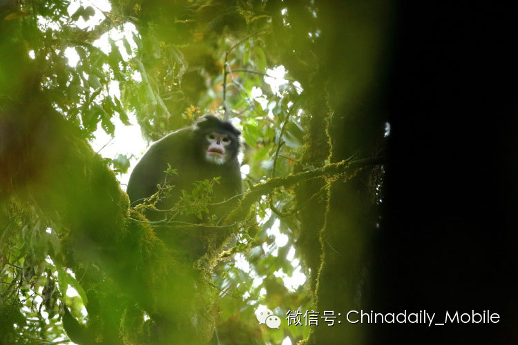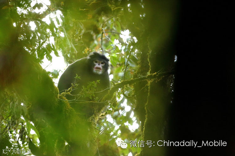 Myanmar snub-nosed monkey peeps through the leaves in Gaoligong Reserve of southwest China's Yunnan province. The monkey, which was given a name in 2009, is so rarely spotted that getting a clear shot of it is extremely difficult.
