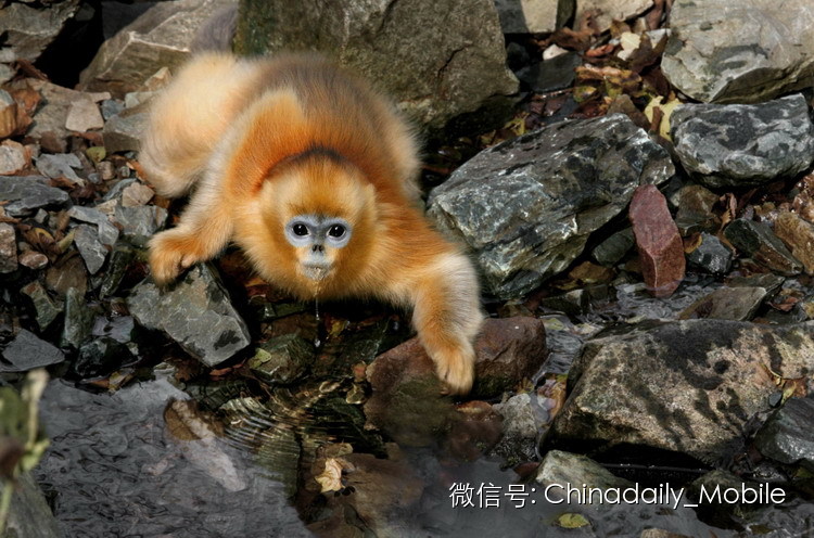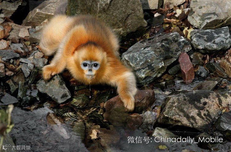 作品《憨态可掬》表现的是一只小猴子到溪边喝水的情景。也许是快门的声音惊动了小家伙,它机警地抬起头来向我隐藏的方向张望,嘴边、颌下毛上所沾的溪水成串的向下滴落,与其机警的神态一起,构成了一幅生动可爱的画面。(摄影师:孙晋强)