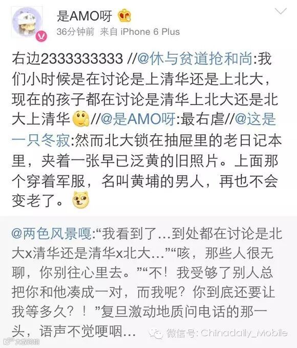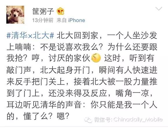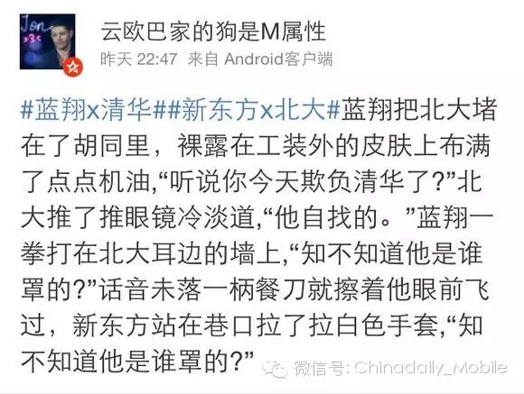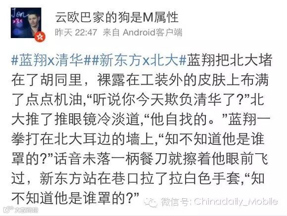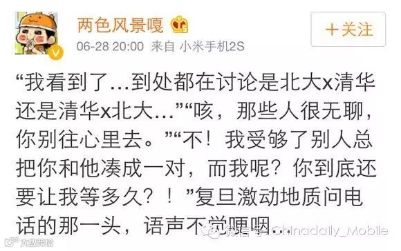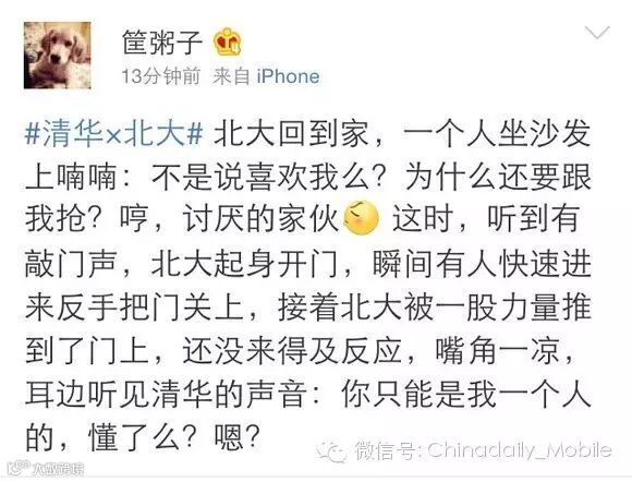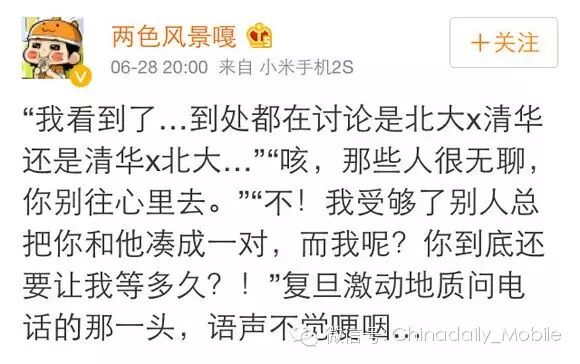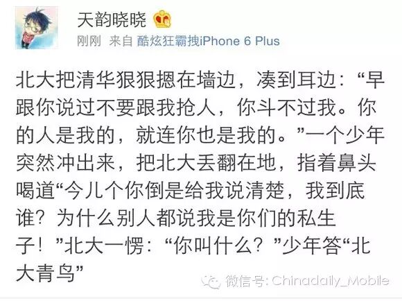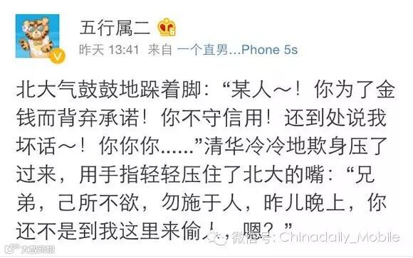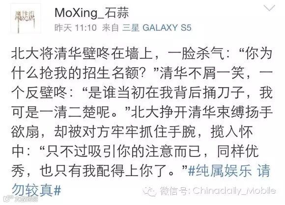 2015年各省的高考成绩陆续出炉,高校的招生工作也逐步展开。作为中国最顶尖的两所大学,清华和北大的招生组为抢夺高分考生(fight for top gaokao scorers)在网上展开互撕(slam each other),也是醉了。