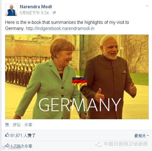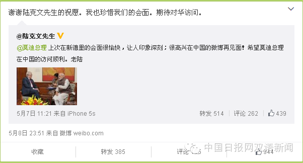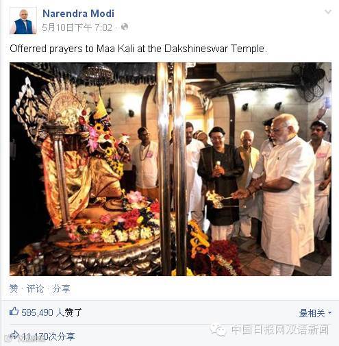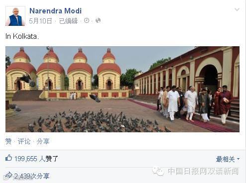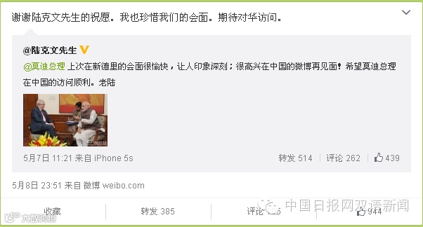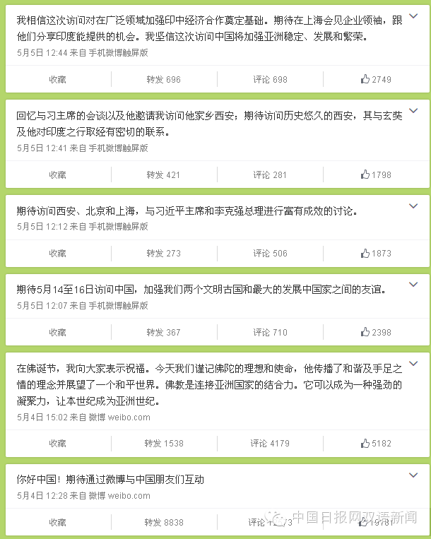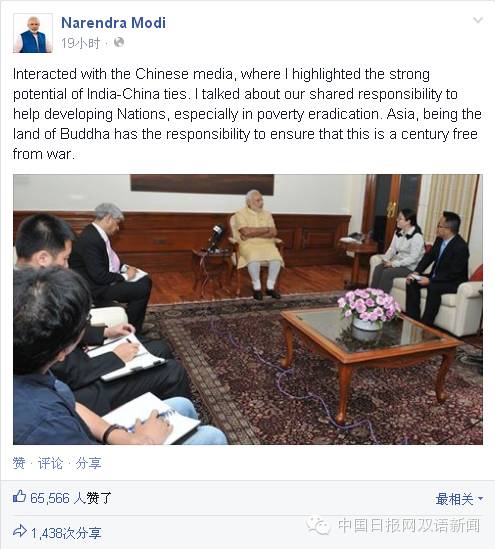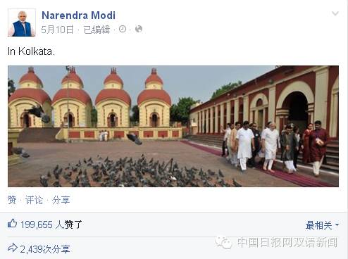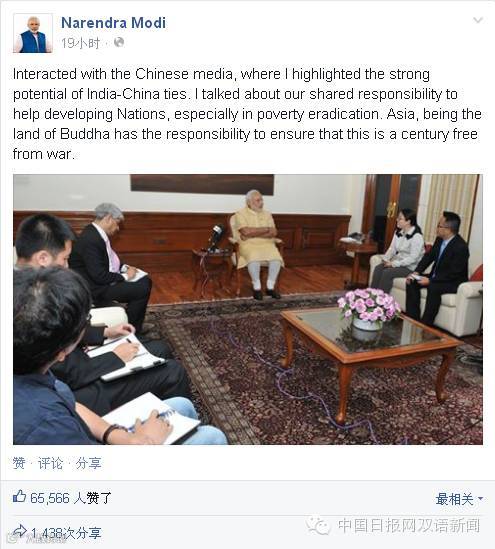 莫迪在访华之前还特意开通了自己的新浪微博个人账号,此举让他在中国的人气大增。