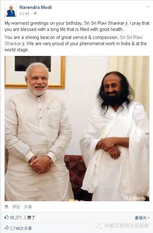 祝我的小伙伴Sri Sri Ravi Shankar ji生快!祝你身体健硕,寿比南山。你是灯塔,照亮着我们,我们为你在印度和世界舞台做出的贡献感到无比骄傲。(双语君乱翻滴,不是印度官方版本哈,下同。)