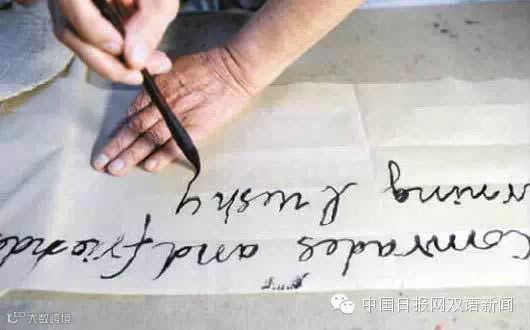 年近九旬的夏爷爷十分开朗,退休后喜欢练毛笔字,有时也用毛笔书写英文。