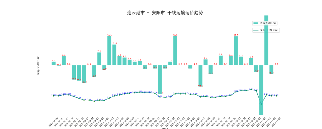本周连云港至安阳干线周平均价为91.27元/吨,按公里数折算为0.191元/吨公里,与上周持平。