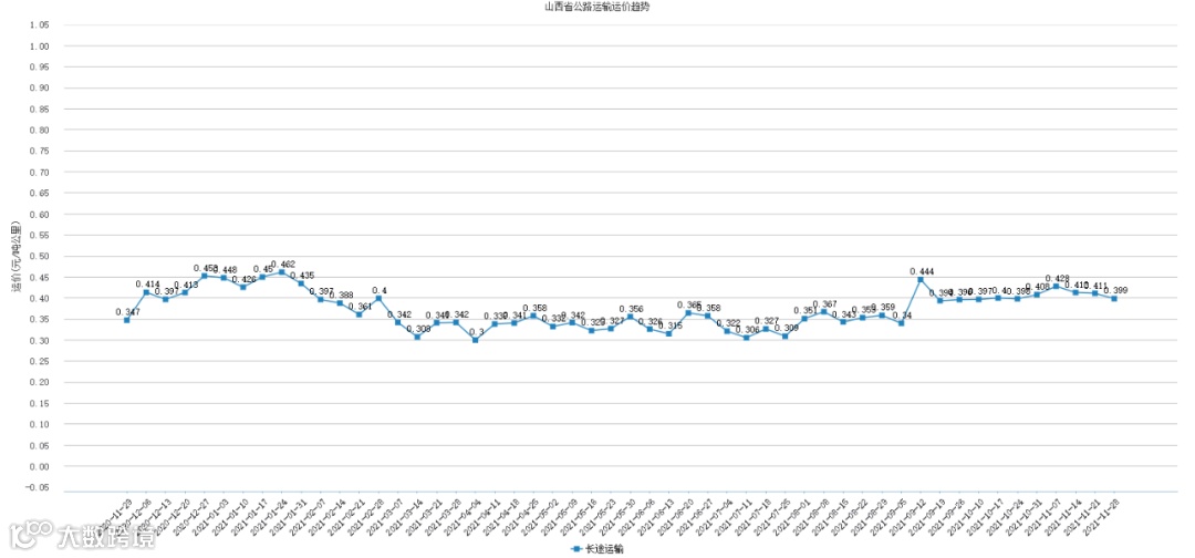本周山西省公路运输运价为0.399元/吨公里,较上周下跌了0.012元/吨公里,跌幅为3.01%。
