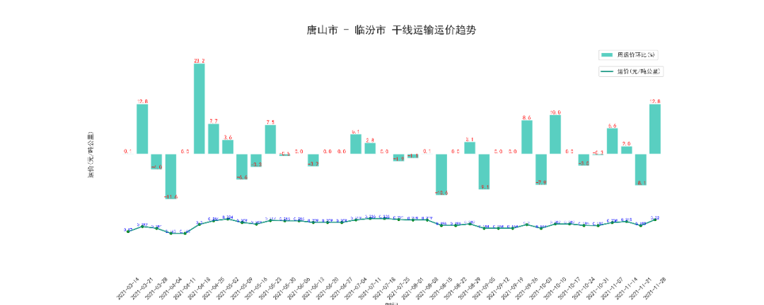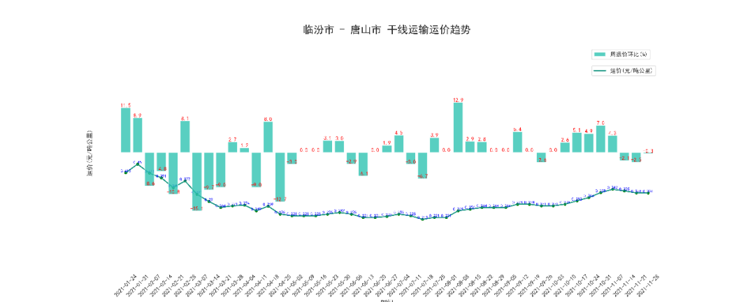 本周唐山至临汾干线周平均价为155.2元/吨,按公里数折算为0.22元/吨公里,上涨了12.8%。