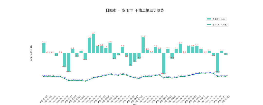 本周日照至安阳干线周平均价为99.47元/吨,按公里数折算为0.212元/吨公里,下跌了1.4%。