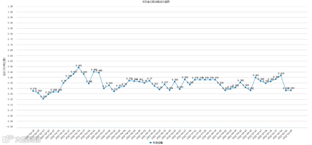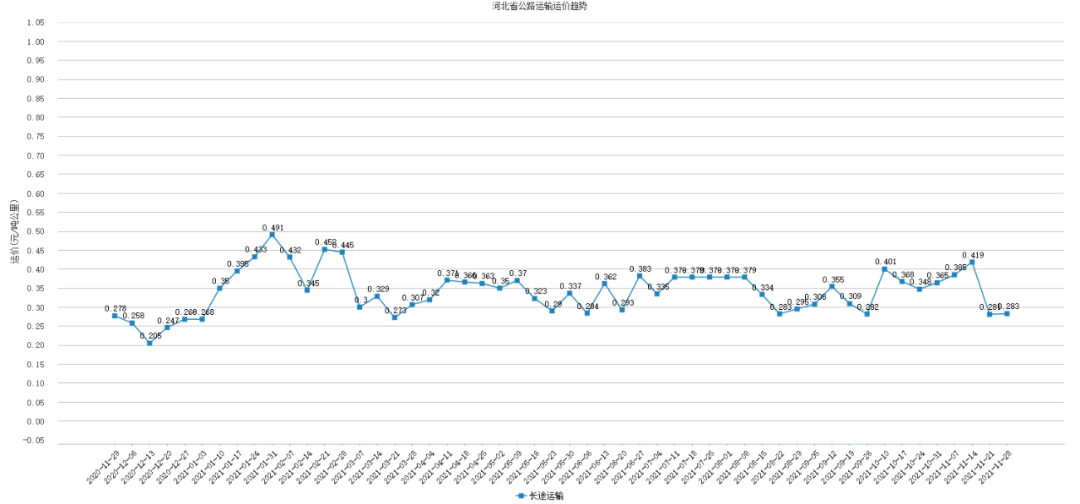 本周河北省公路运输运价为0.283元/吨公里,较上周上涨了0.002元/吨公里,涨幅为0.71%。