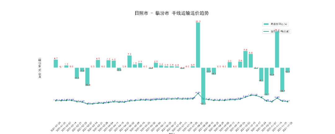 本周临汾至日照干线周平均价为230元/吨,按公里数折算为0.315元/吨公里,上涨了12.0%。