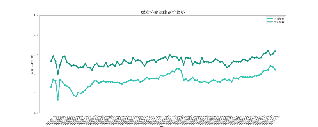 本周煤炭长途运输运价为0.455元/吨公里,较上周下跌了0.015元/吨公里,跌幅为3.17%;中途运输运价为0.611元/吨公里,较上周上涨了0.018元/吨公里,涨幅为3.08% 。