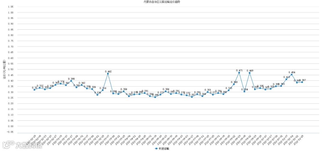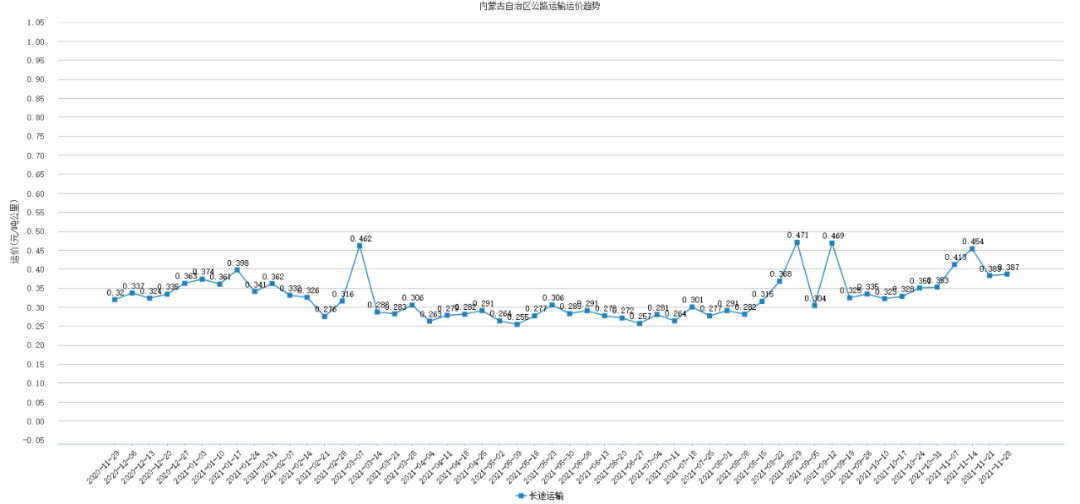 本周内蒙古公路运输运价为0.387元/吨公里,较上周上涨了0.004元/吨公里,涨幅为1.04%。