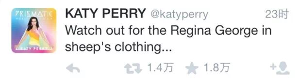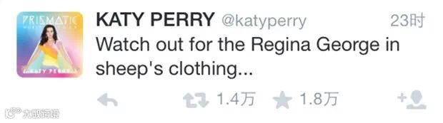 “水果姐”凯蒂·派瑞则随后发推文,疑似回应泰勒新歌暗讽事件。水果姐说“小心披着羊皮的贱女孩Regina George……”Regina George指的是2004年热门电影《贱女孩》里的蛇蝎心肠校花。