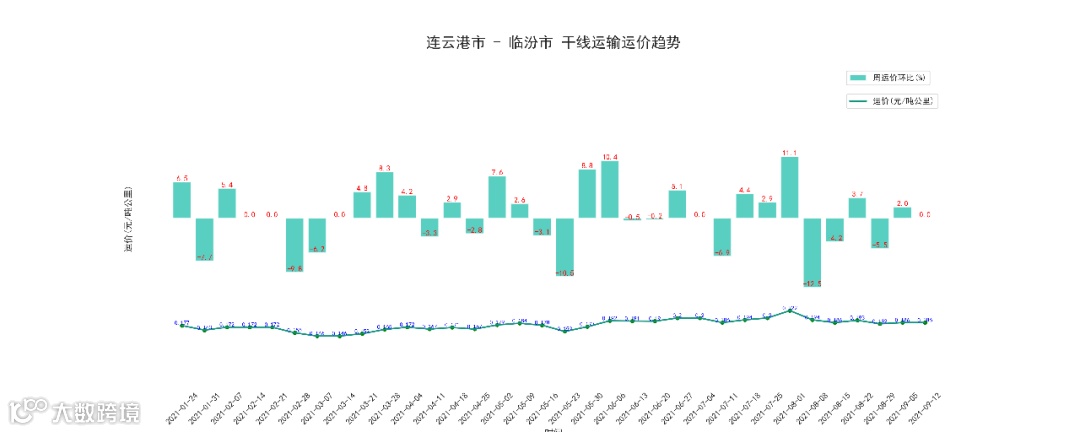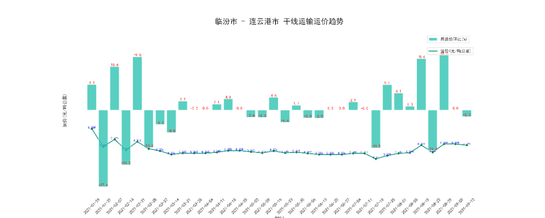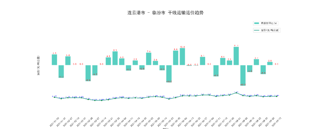 本周连云港至临汾干线周平均价为133.87元/吨,按公里数折算为0.186元/吨公里,与上周持平。