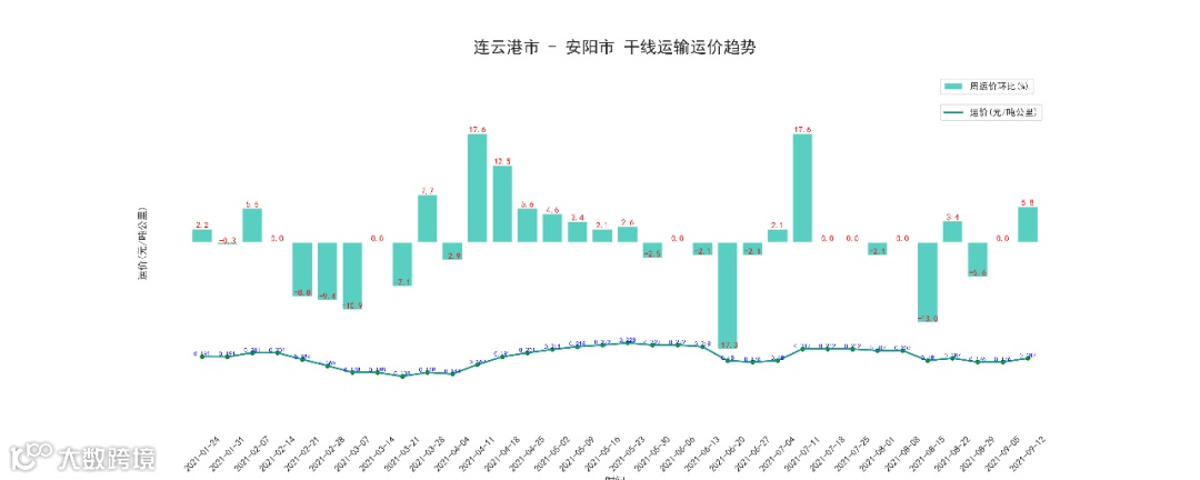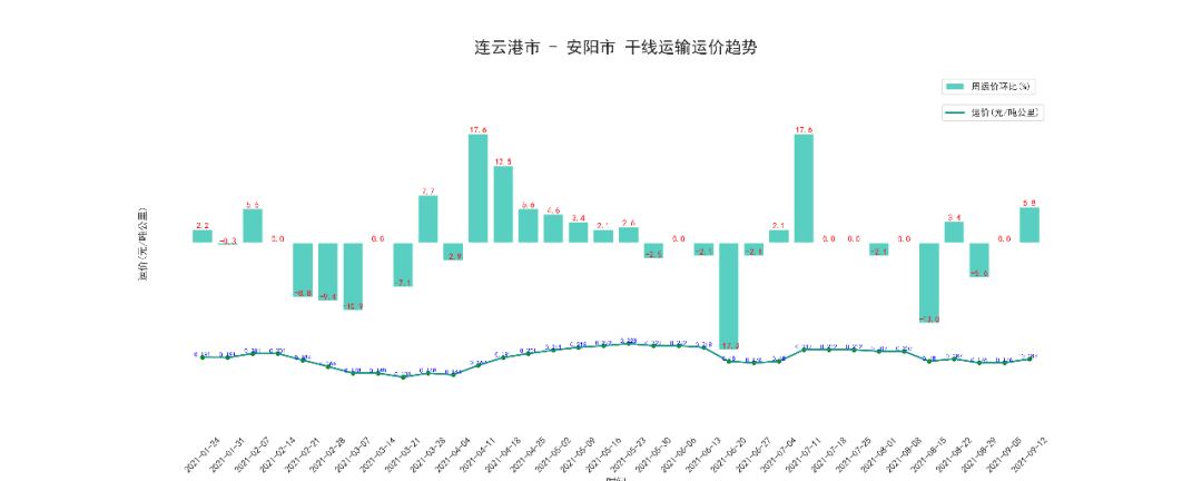 本周连云港至安阳干线周平均价为88.43元/吨,按公里数折算为0.187元/吨公里,上涨了5.8%。