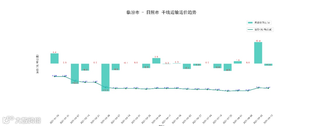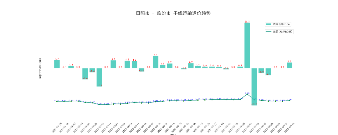 本周临汾至日照干线周平均价为180元/吨,按公里数折算为0.247元/吨公里,降低了1.3%。