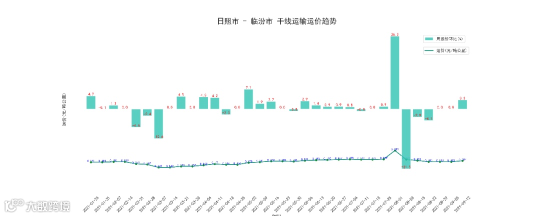 本周日照至临汾干线周平均价为137.10元/吨,按公里数折算为0.189元/吨公里,上涨了3.3%。