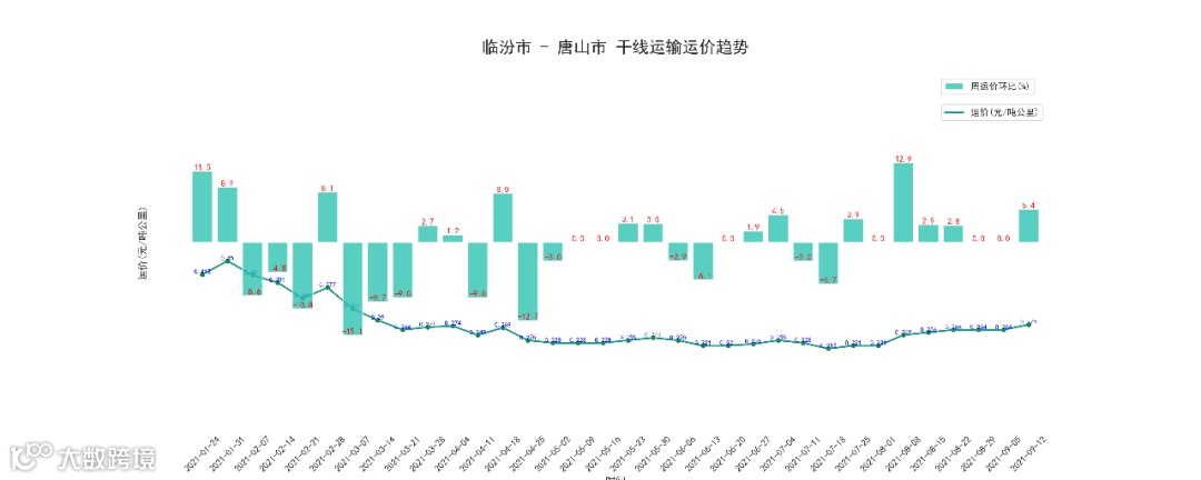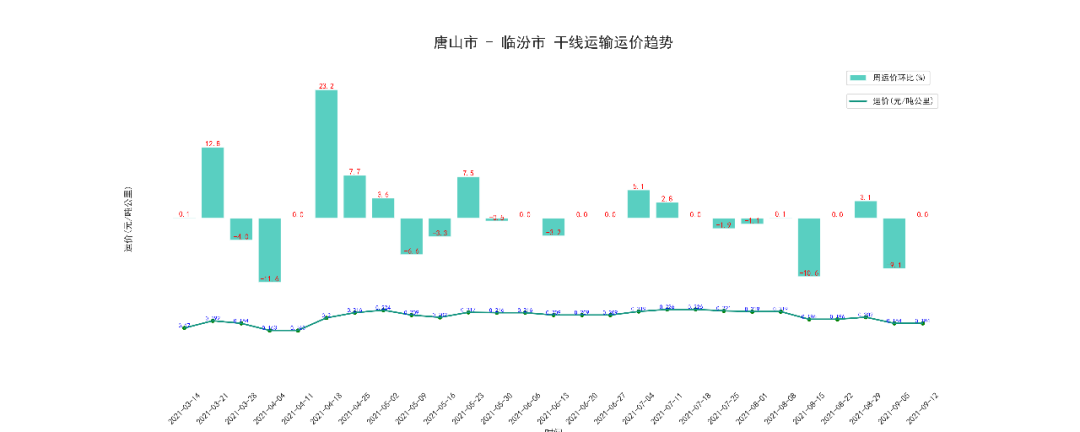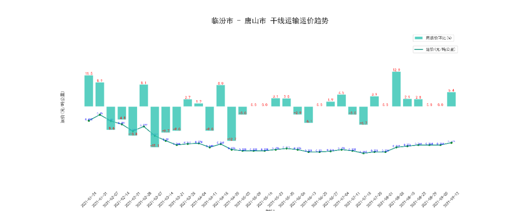 本周临汾至唐山干线周平均价为194.12元/吨,按公里数折算为0.278元/吨公里,上涨了5.4%。