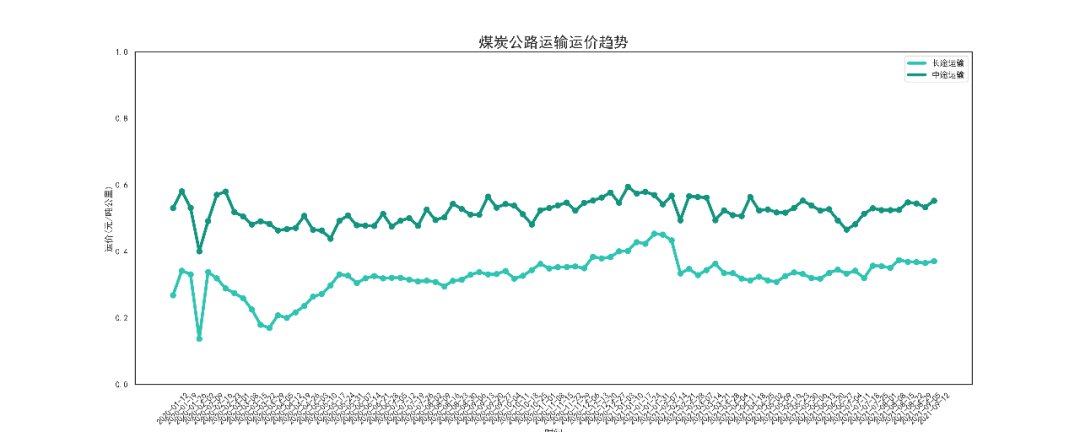本周煤炭长途运输运价为0.372元/吨公里,较上周上涨0.008元/吨公里,涨幅为2.17%;中途运输运价为0.550元/吨公里,较上周上涨0.017元/吨公里,涨幅为3.55% 。