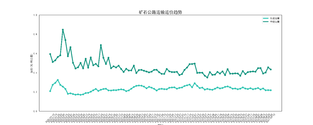 本周矿石长途运输运价为0.217元/吨公里,较上周跌幅了0.003元/吨公里,跌幅为1.33%;中途运输运价为0.444元/吨公里,较上周跌幅0.012元/吨公里,跌幅为2.55% 。