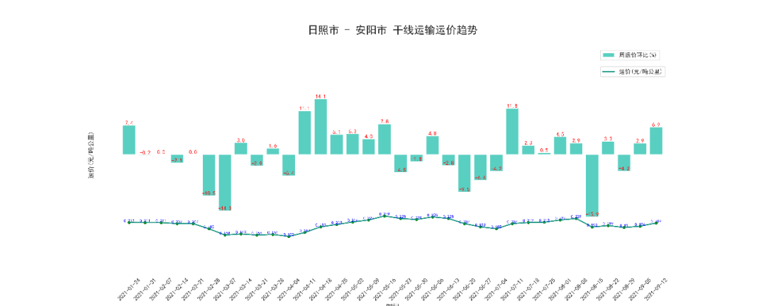 本周日照至安阳干线周平均价为98.44元/吨,按公里数折算为0.209元/吨公里,上涨了6.9%。