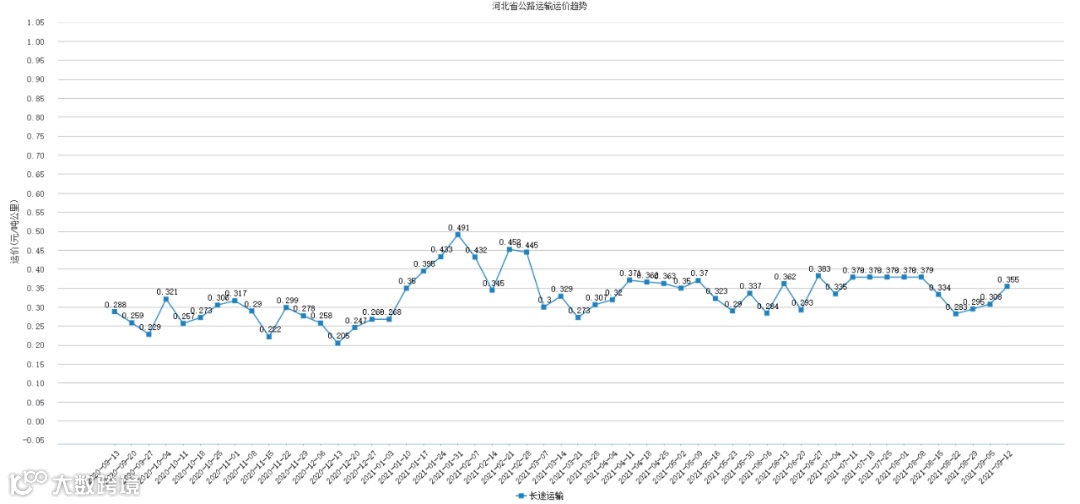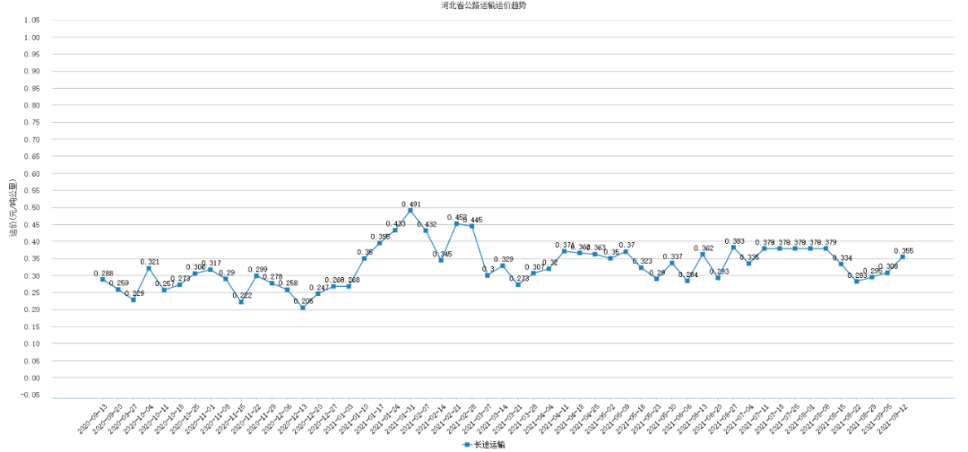 本周河北省公路运输运价为0.355元/吨公里,较上周上涨了0.047元/吨公里,涨幅为15.26%。