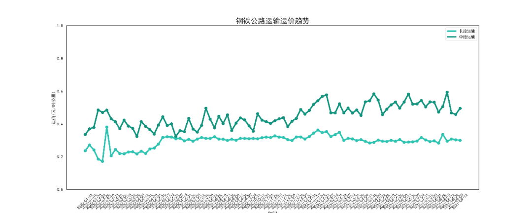 本周钢铁长途运输运价为0.302元/吨公里,较上周下跌了0.0004元/吨公里,跌幅为0.14%;中途运输运价为0.499元/吨公里,较上周上涨了0.052元/吨公里,涨幅为11.43% 。