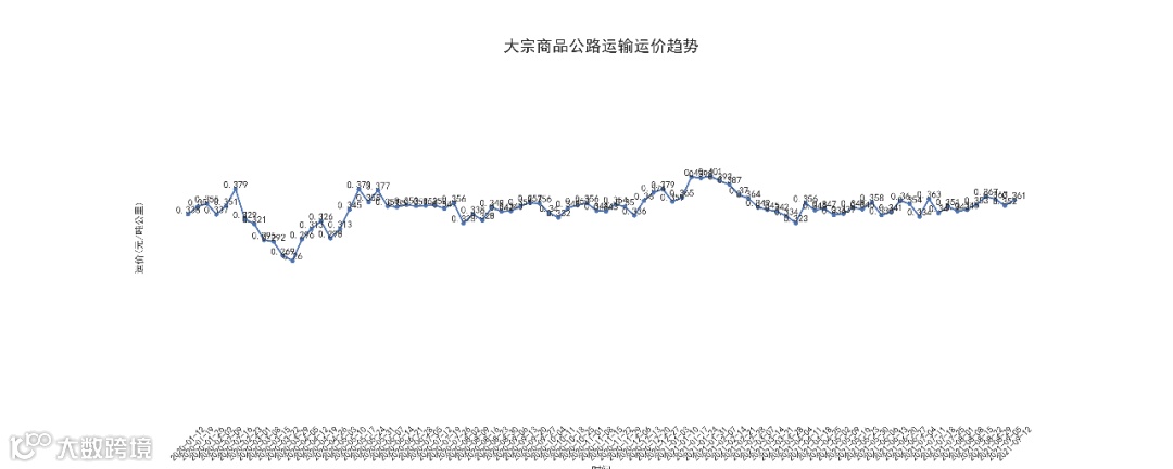 本周大宗商品公路运输运价为0.361元/吨公里,较上周上涨了0.009元/吨公里,涨幅为2.56%。