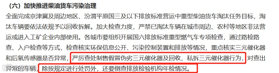 10月29日,生态环境部、国家发展和改革委员会等中央12部门和7省市联合印发《2021-2022年秋冬季大气污染综合治理攻坚方案》,其中就提到了私拆三元催化器的相关内容。开LNG车的卡友都知道,国六燃气车的三元催化器很值钱,随着国六车数量的增多,不仅在服务区内偷窃三元催化器的小偷变多了,甚至还出现了为快速回本而私自拆卸三元催化器的卡友。