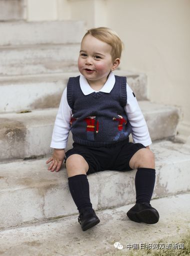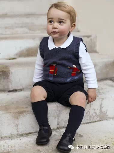 照片中的乔治圆圆的脸蛋红扑扑的,长得越来越像他父亲小时候的样子。他坐在台阶上,身穿娃娃领的白色恤衫外加一件蓝色绣花毛衣,下身穿着一条蓝色短裤和及膝长袜。