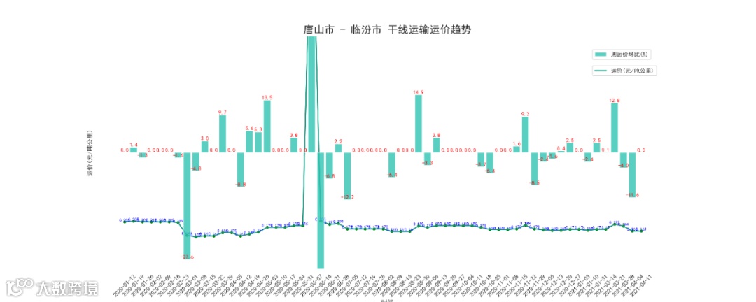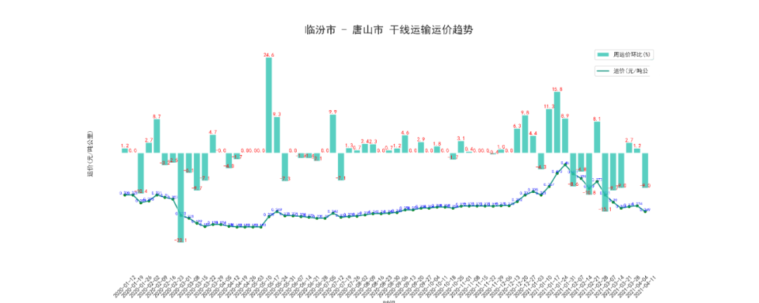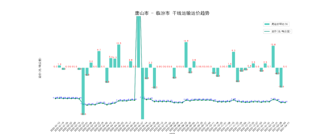 本周唐山至临汾干线周平均价为121元/吨,按公里数折算为为0.163元/吨公里,与上周持平。