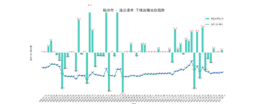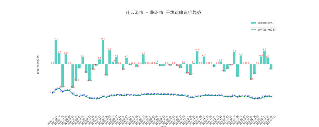 本周临汾至连云港干线周平均价为174.25元/吨,按公里数折算为0.248元/吨公里,上升了2.1%。